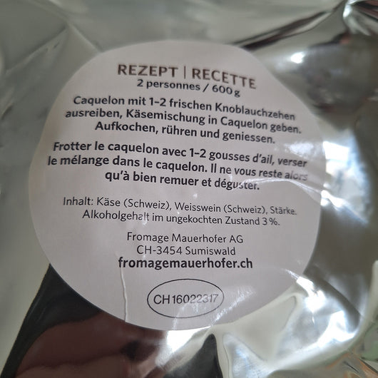 Diese Fonduemischung muss nur noch erwärmt werden. Neben unserer Käsemischung ist etwas Stärke und vor allem ein ausgezeichneter Schweizer Chasselas enthalten. Gemütlichkeit und Genuss im Handumdrehen.